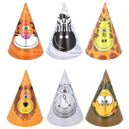 De tre dyrene har festlige pompoms festet øverst på festhattene